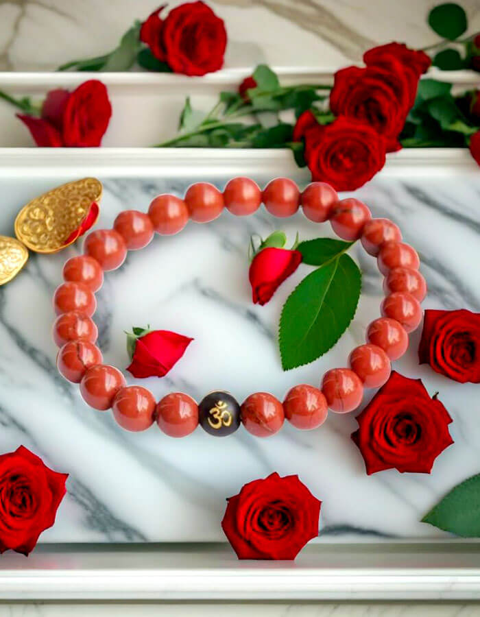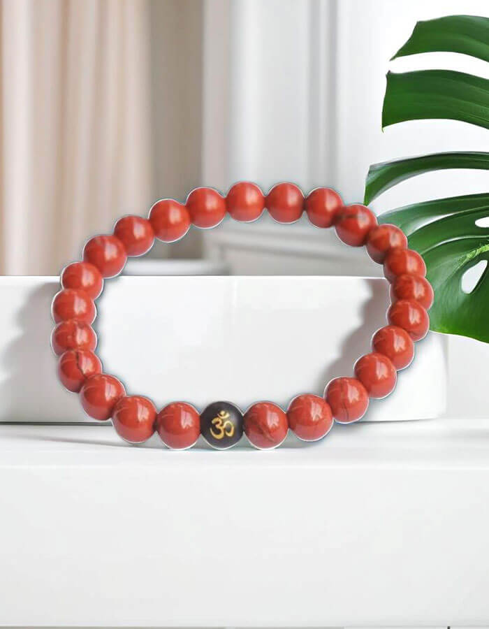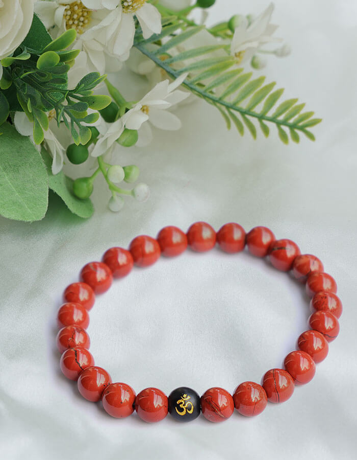Aesthetic Appeal: A striking combination of deep red Jasper beads paired with sleek black Onyx, featuring a beautifully engraved Om charm, symbolizing spirituality and serenity.